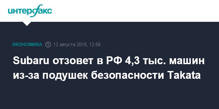 Москва. 12 августа. INTERFAX.RU – Российское подразделение японского автопроизводителя Subaru ООО "Субару Мотор" отзывает 4280 автомобилей Subaru Impreza, WRX и WRXSTI.