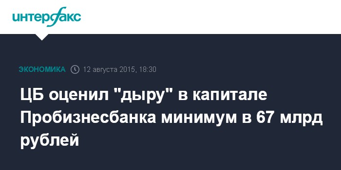Москва. 12 августа. INTERFAX.RU - Банк России оценивает "дыру" в капитале Пробизнесбанка в 67 млрд рублей, передал через пресс-службу зампред ЦБ Михаил Сухов.