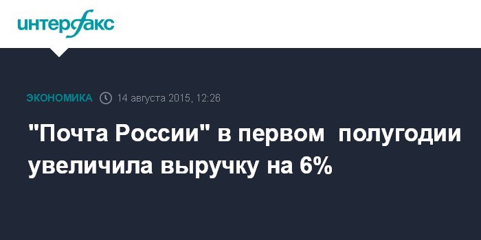 Москва. 14 августа. INTERFAX.RU – Выручка "Почты России" по РСБУ по итогам первого полугодия 2015 года увеличилась на 6% по сравнении с аналогичным периодом прошлого года, до 70,3 млрд рублей, говорится в сообщении компании.