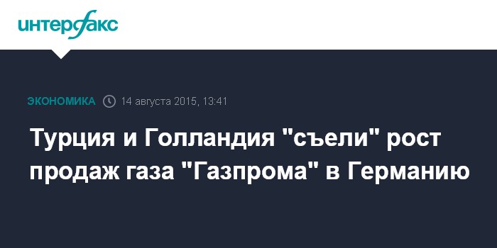 Москва. 14 августа. INTERFAX.RU – Поставки "Газпромом" в Турцию во втором квартале текущего года снизились на 15%, в Нидерланды - на 64%, чем за тот же квартал 2014 года, следует из отчетности компании.