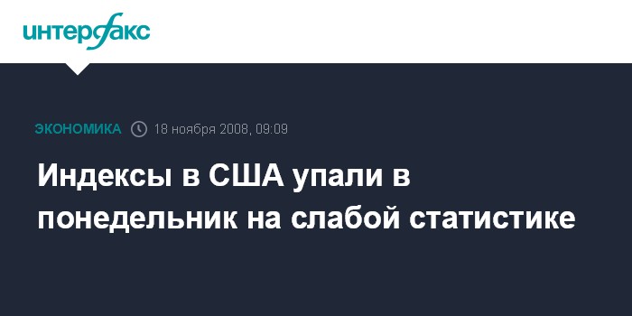 Москва. 18 ноября. INTERFAX.RU - Американские фондовые индексы упали по итогам торгов в понедельник более чем на 2% на данных о рекордном снижении индекса производственной активности Empire Manufacturing, рассчитываемого Федеральным резервным банком (ФРБ) Нью-Йорка, сообщает агентство Bloomberg. Негативное влияние на рынок оказала также информации о намерении Citigroup сократить 52 тыс. рабочих мест. Во вторник фьючерсы на индексы продолжают падать, к 8:25 мск их снижение составляет 0,3-0,5%.
