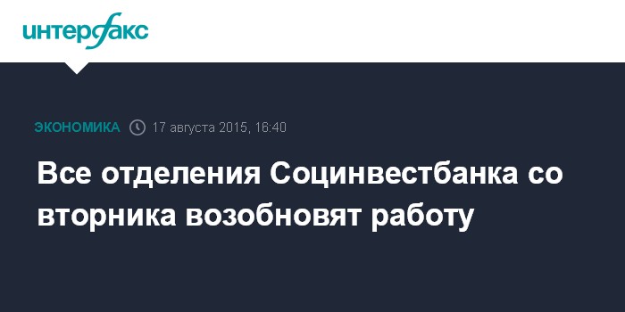 Москва. 17 августа. INTERFAX.RU – Все отделения Социнвестбанка (г.Уфа) с 18 августа 2015 года возобновляют свою работу по обслуживанию клиентов, говорится в сообщении Агентства по страхованию вкладов.