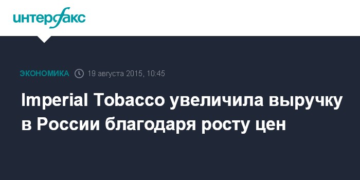 Москва. 19 августа. INTERFAX.RU – Производитель сигарет Imperial Tobacco за девять месяцев 2015 финансового года (завершились 30 июня) сократил продажи табачной продукции до 207,4 млрд единиц с 213,3 млрд единиц годом ранее.