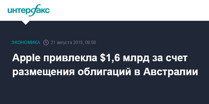 Москва. 21 августа. INTERFAX.RU – Apple Inc. привлекла 2,25 млрд австралийских долларов ($1,6 млрд) за счет размещения двух выпусков облигаций в Австралии, которое стало для компании дебютным в этой стране, сообщает агентство Bloomberg.