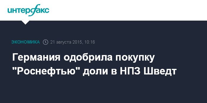 Москва. 21 августа. INTERFAX.RU – "Роснефть" получила согласие антимонопольного ведомства Германии по заявке на покупку у Total доли в размере 16,67% в нефтеперерабатывающем заводе в городе Шведт (Германия).