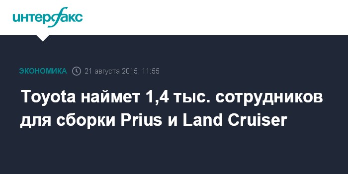 Москва. 21 августа. INTERFAX.RU – Японский автомобилестроительный концерн Toyota Motor Corp. намерен увеличить штат своих заводов, выпускающих гибридный автомобиль марки Prius и внедорожник Land Cruiser, на 1,4 тыс. человек, сообщает агентство Bloomberg со ссылкой на информированный источник.