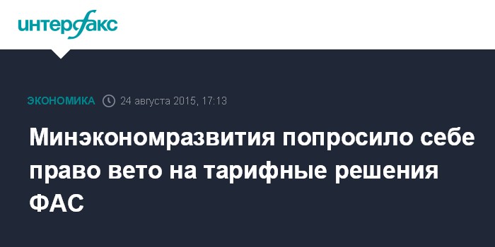 Москва. 24 августа. INTERFAX.RU – Глава Минэкономразвития Алексей Улюкаев попросил премьер-министра Дмитрия Медведева наделить представителей его ведомства в правлении Федеральной антимонопольной службы правом вето на принимаемые тарифные решения.