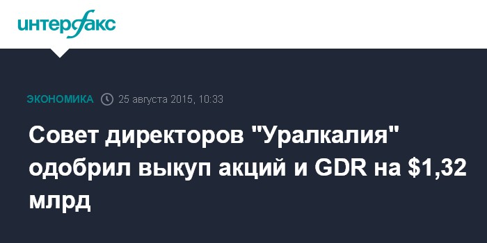 Москва. 25 августа. INTERFAX.RU – Совет директоров "Уралкалия" одобрил программу приобретения акций и GDR на сумму до $1,32 млрд, говорится в сообщении компании.