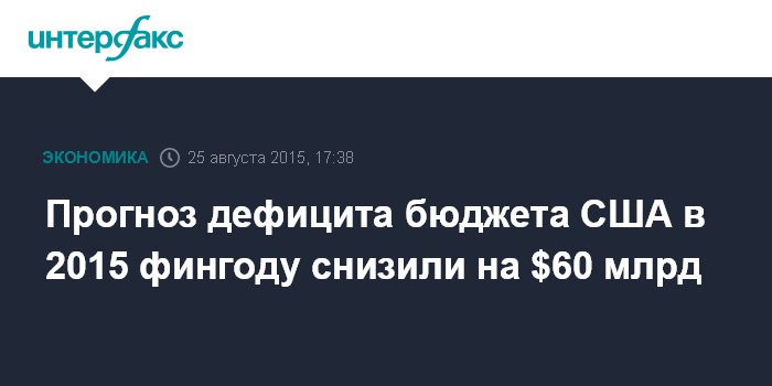 Москва. 25 августа. INTERFAX.RU – Бюджетное управление Конгресса (CBO) ожидает, что дефицит госбюджета США по итогам 2015 финансового года, который завершится 30 сентября, составит $426 млрд, или 2,4% ВВП. Это на $60 млрд ниже мартовской оценки CBO, которая составляла $486 млрд (2,7% ВВП), пишет MarketWatch.