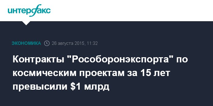 Москва. 26 августа. INTERFAX.RU – Общая сумма контрактов "Рособоронэкспорта" по космическим проектам за период с 2000 года превысила $1 млрд, сообщил в ходе авиационно-космического салона МАКС-2015 глава предприятия Анатолий Исайкин