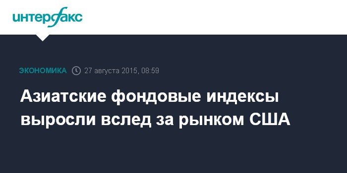 Москва. 27 августа. INTERFAX.RU - Азиатские фондовые индексы растут в четверг вслед за фондовым рынком США, сообщает агентство Bloomberg.