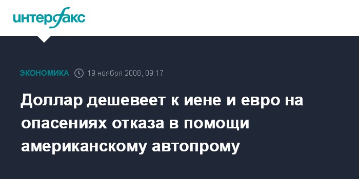 Москва. 19 ноября. INTERFAX.RU - Курс доллара США падает к японской иене и единой европейской валюте в среду, поскольку трейдеры опасаются, что американские регуляторы откажут в госпомощи автомобильным компаниям, сообщает агентство Bloomberg.