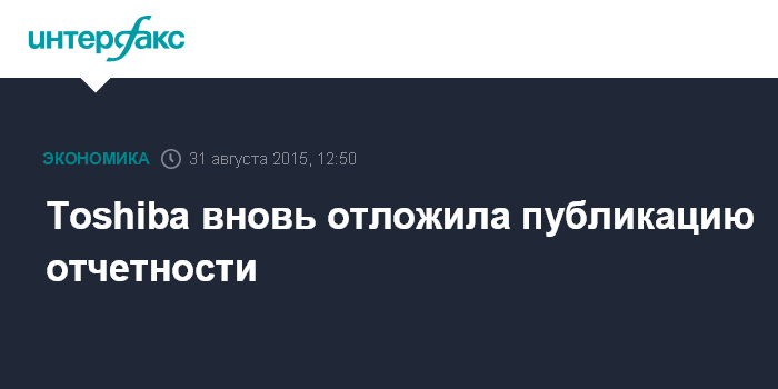 Москва. 31 августа. INTERFAX.RU – Японская Toshiba Corp. вновь отложила публикацию отчетности за прошедший финансовый год, завершившийся в марте 2015 года, сообщает агентство Bloomberg.