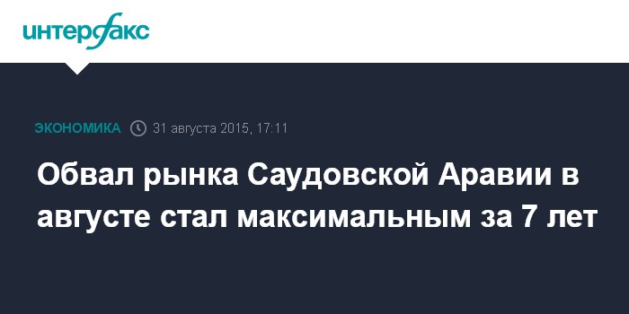 Москва. 31 августа. INTERFAX.RU – Продолжающееся снижение цен на нефть привело к самому значительному месячному падению фондового рынка Саудовской Аравии за почти семь лет. Как сообщает агентство Bloomberg, по темпам падения Саудовскую Аравию в августе опередила только Греция.