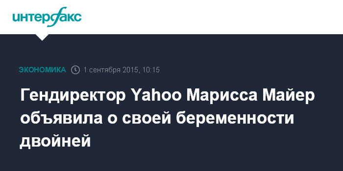 Москва. 1 сентября. INTERFAX.RU – Главный исполнительный директор Yahoo! Inc. Марисса Майер объявила о беременности в своем блоге Tumblr. Рождение двух девочек-близнецов ожидается в декабре.
