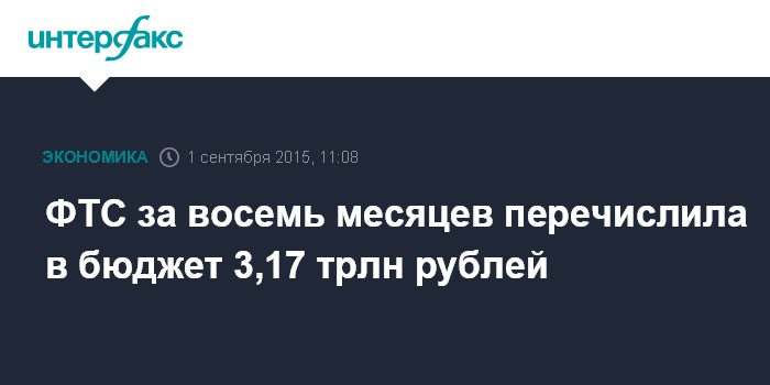 Москва. 1 сентября. INTERFAX.RU – Федеральная таможенная служба за январь-август 2015 года перечислила в бюджет РФ 2 трлн 171,5 млрд рублей, заявил глава ФТС Андрей Бельянинов журналистам в Москве.