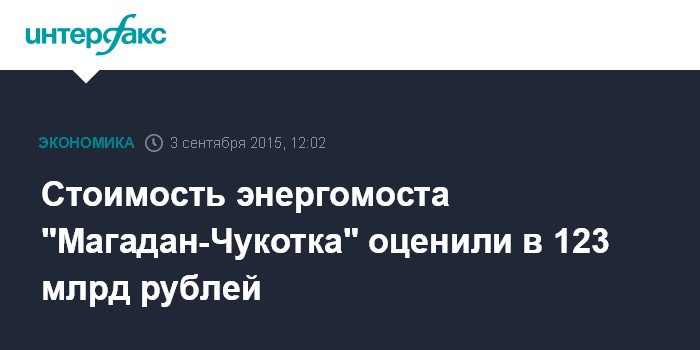 Москва. 3 сентября. INTERFAX.RU – Стоимость инфраструктурного проекта "Строительство и эксплуатация ВЛ "Билибино - Кекура - Песчанка - Омсукчан" (энергомост "Магадан-Чукотка"), по оценке проектировщиков, составляет 123 млрд рублей в текущих ценах, сообщил генеральный директор "РАО ЭС Востока" Сергей Толстогузов на Восточном экономическом форуме в четверг.