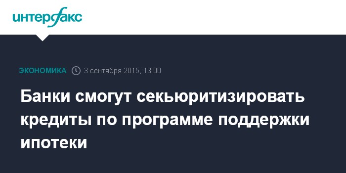 Москва. 3 сентября. INTERFAX.RU – Минфин хочет до конца года внести изменения в программу субсидирования ставок по ипотеке, разрешив банкам секьюритизировать кредиты, выданные по этой программе, сообщил глава департамента финансовой политики Минфина Сергей Барсуков журналистам в Сочи в четверг.