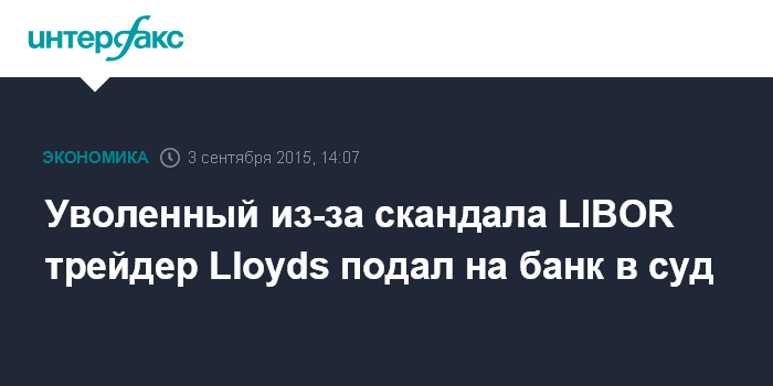 Москва. 3 сентября. INTERFAX.RU – Бывший трейдер банка Lloyds Banking Group обратился в суд, требуя признать его увольнение неправомерным, сообщает агентство Bloomberg.