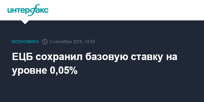 Москва. 3 сентября. INTERFAX.RU – Европейский центральный банк по итогам сентябрьского заседания не стал менять базовую процентную ставку по кредитам, оставив ее на рекордно низком уровне в 0,05% годовых, говорится в сообщении банка.