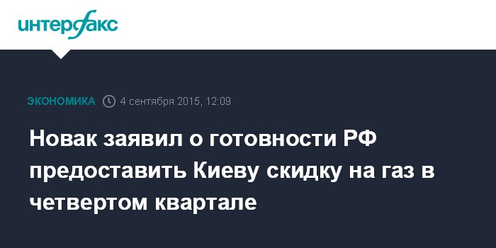 Москва. 4 сентября. INTERFAX.RU – Россия готова предоставить Украине скидку на газ в четвертом квартале, при этом цена будет на уровне цен для сопредельных с Украиной стран, например, с Польшей, заявил в эфире телеканала "Россия 24" министр энергетики РФ Александр Новак. Но Киев пока не обращался за скидкой.