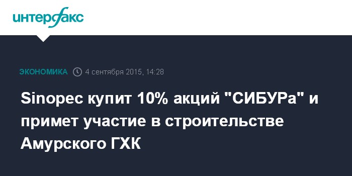 Вместе с тем источник подчеркивал, что заключение сделки по пакету акций автоматически не означает, что Sinopec будет партнером "СИБУРа" по Амурскому ГХК или будет финансировать проект "ЗапСиб-2" (Запсибнефтехим).
