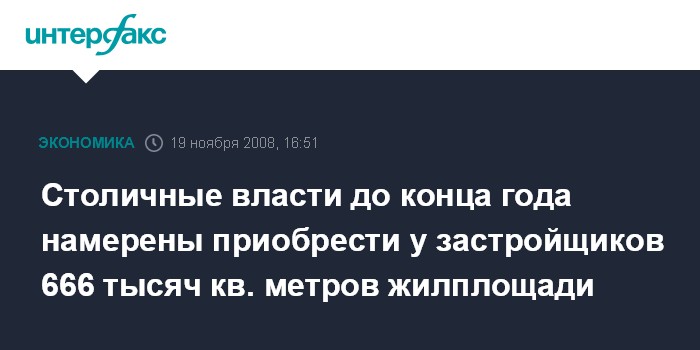 Москва. 19 ноября. INTERFAX.RU - До конца года столичные власти планируют провести ряд открытых аукционов по выкупу 666 тыс. кв. метров жилплощади у компаний-застройщиков. Несмотря на мистическое число, такие объемы существенно поддержат девелоперские компании в кризис.