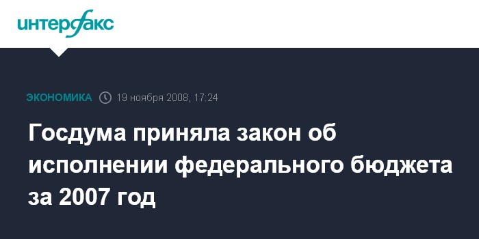 Москва. 19 ноября. INTERFAX.RU - Госдума на пленарном заседании в среду приняла закон об исполнении бюджета РФ за 2007 год.