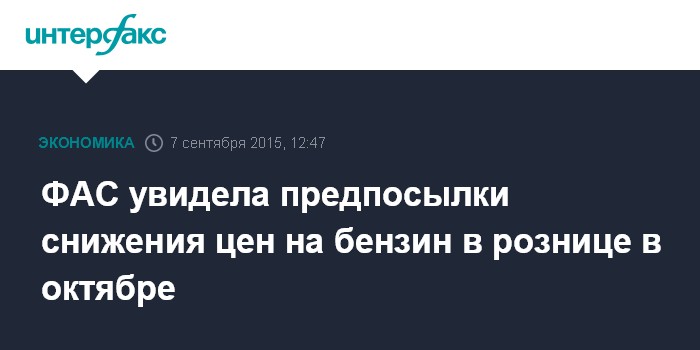 Москва. 7 сентября. INTERFAX.RU – Федеральная антимонопольная служба видит предпосылки для снижения розничных цен на бензин с конца октября, заявил начальник управления контроля топливно-энергетического комплекса ФАС Дмитрий Махонин на пресс-конференции в Москве.