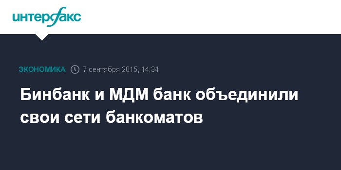 Москва. 7 сентября. INTERFAX.RU – МДМ банк, Бинбанк, а также "Бинбанк - кредитные карты" (ранее - Москомприватбанк) объединили банкоматные сети. Сотрудничество предусматривает снятие клиентами кредитных организаций наличных средств и получение информации по картам в банкоматах банка-партнера без дополнительных комиссий, говорится в пресс-релизе МДМ банка.