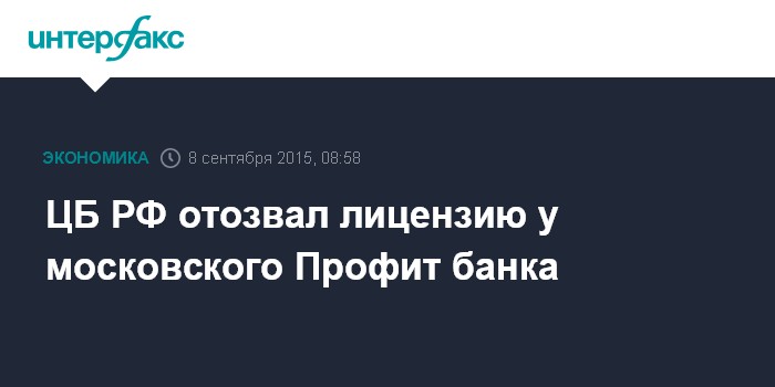 Москва. 8 сентября. INTERFAX.RU - Центральный банк РФ отозвал лицензию на осуществление банковских операций у московского Профит банка, говорится в сообщении ЦБ.