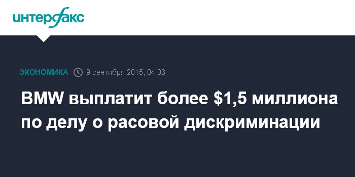 Москва. 9 сентября. INTERFAX.RU - BMW согласилась выплатить $1,6 миллиона по искам десятков бывших чернокожих рабочих, которые считают себя жертвами расовой дискриминации, сообщило в среду агентство Associated Press.