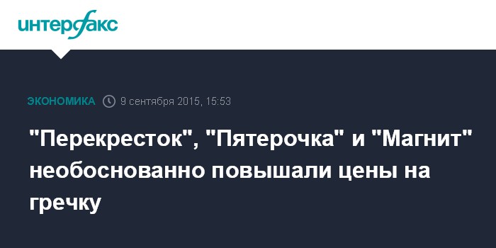 Москва. 9 сентября. INTERFAX.RU – Управление ФАС по Самарской области признало сети "Перекресток", "Пятерочка" и "Магнит" нарушившими закон о защите конкуренции за необоснованное повышение цен на гречку.