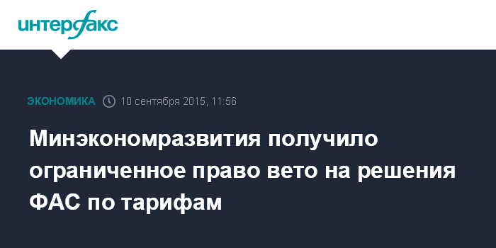 Москва. 10 сентября. INTERFAX.RU – Минэкономразвития, которое будет представлено двумя членами в коллегиальном органе ФАС по тарифным решениям, получило право накладывать вето, но лишь по ряду вопросов.