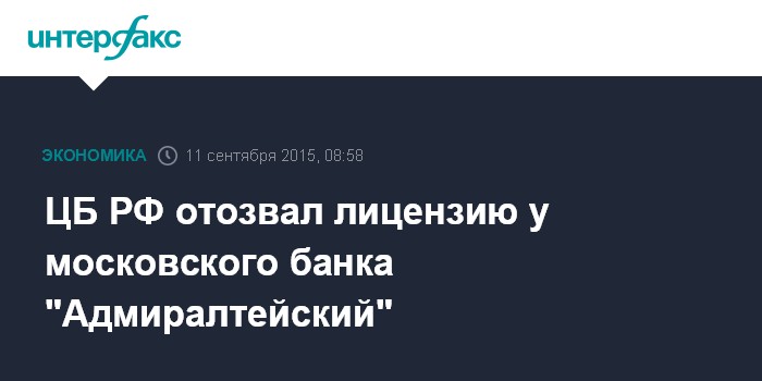 Москва. 11 сентября. INTERFAX.RU – Банк России отозвал лицензию на осуществление банковских операций у московского банка "Адмиралтейский", говорится в сообщении ЦБ. Лицензия отозвана с 11 сентября.