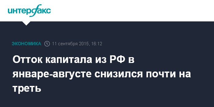 Москва. 11 сентября. INTERFAX.RU – Отток капитала из России в январе-августе 2015 года снизился до $52 млрд с $77,1 млрд за аналогичный период прошлого года, заявила председатель ЦБ РФ Эльвира Набиуллина на пресс-конференции по итогам заседания совета директоров Банка России в пятницу.