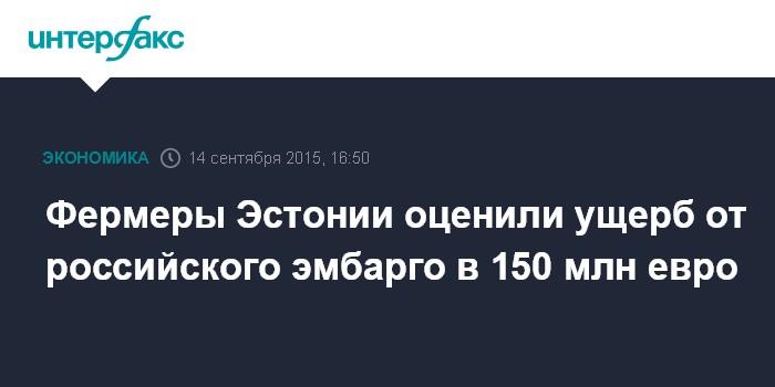 Москва. 14 сентября. INTERFAX.RU – Эстонские фермеры считают, что ущерб от российского эмбарго с учетом косвенного влияния может составить 150 миллионов. В дополнение к ущербу от продэмбарго, на аграрном секторе страны негативно сказались и последствия африканской чумы свиней.