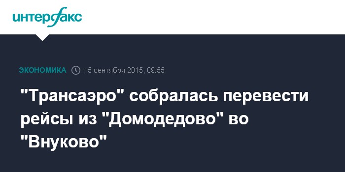Москва. 15 сентября. INTERFAX.RU – Авиакомпания "Трансаэро", которая находится в процессе присоединения к группе "Аэрофлот", может перевести все свои рейсы из "Домодедово" во "Внуково", пишет во вторник газета "Ведомости" со ссылкой на акционера авиаперевозчика и председателя совета директоров "Внуково" Виталия Ванцева.