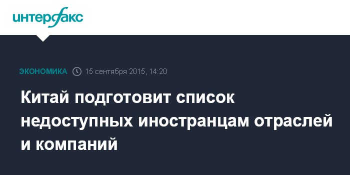 Москва. 15 сентября. INTERFAX.RU – Власти Китая утвердили рекомендации для списка отраслей экономики и отдельных предприятий, которые будут недоступны иностранным инвесторам, передает агентство "Синьхуа".