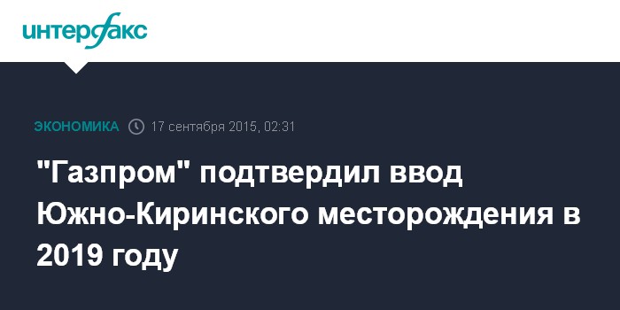 Москва. 17 сентября. INTERFAX.RU - "Газпром" подтвердил ранее названный срок ввода подпавшего под секторальные санкции США Южно-Киринского месторождения на шельфе Сахалина в 2019 году.