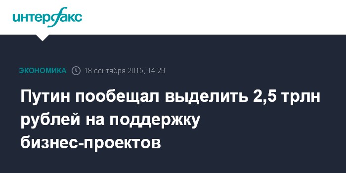 Москва. 18 сентября. INTERFAX.RU - Правительство РФ выделит 2,5 трлн рублей на поддержку инвесторов, которые реализуют бизнес-проекты, сообщил президент РФ Владимир Путин.