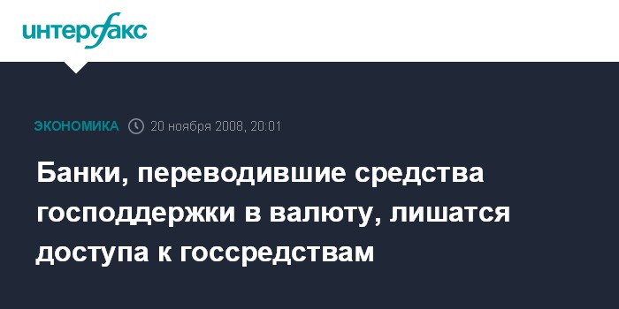 Москва. 20 ноября. INTERFAX.RU - Банки, переводившие средства господдержки в валюту, лишатся доступа к госсредствам, заявил первый вице-премьер РФ Игорь Шувалов журналистам в четверг.
