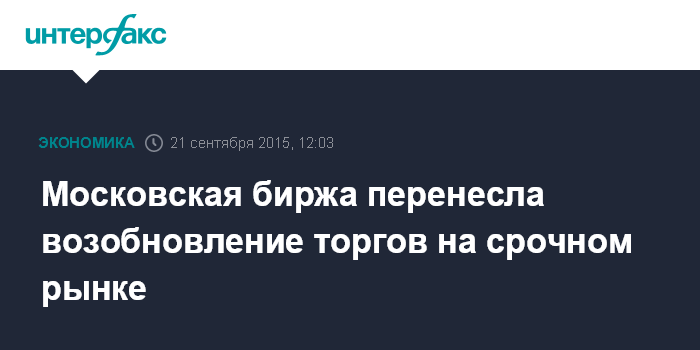 Москва. 21 сентября. INTERFAX.RU – Московская биржа перенесла возобновление торгов на срочном рынке с 11:45 мск, сообщила биржа.