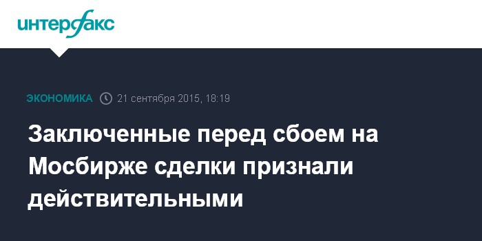 Москва. 21 сентября. INTERFAX.RU - Сделки, заключенные в ходе торгов Московской биржи до сбоя в понедельник, 21 сентября, оформлены в соответствии с правилами торгов и являются действительными, говорится в сообщении биржи.