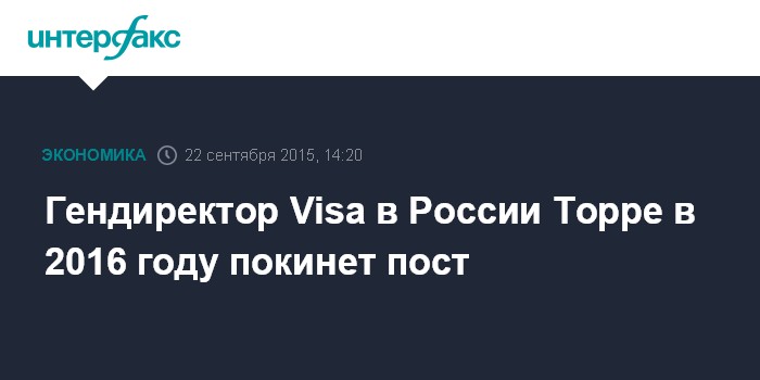 Москва. 22 сентября. INTERFAX.RU – Генеральный директор Visa в России Эндрю Торре с 2016 года будет курировать бизнес компании в ряде африканских стран, сообщил он журналистам во вторник.