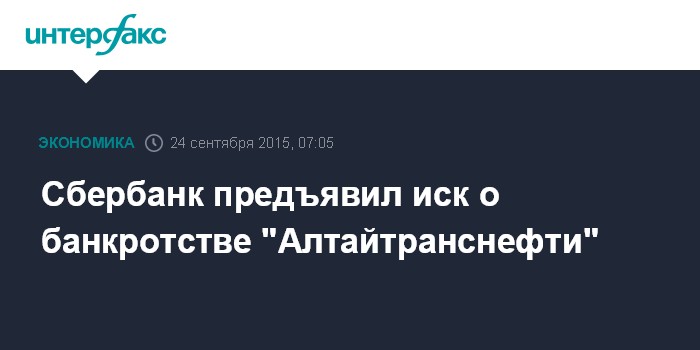 Москва. 24 сентября. INTERFAX.RU - Сбербанк России предъявил иск о банкротстве ООО "Алтайтранснефть" (республика Алтай), говорится в материалах Арбитражного суда республики Алтай.