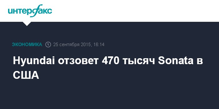 Москва. 25 сентября. INTERFAX.RU - Компания Hyundai отзовет со 2 ноября в США 470 тысяч седанов Hyundai Sonata, выпущенных с 2011 по 2012 год, сообщило в пятницу информационное агенство Associated Press.