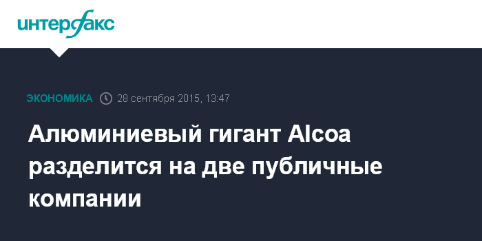 Москва. 28 сентября. INTERFAX.RU – Американская Alcoa, крупнейший мировой производитель алюминия по капитализации, в понедельник объявила о предстоящем разделении на две публичные независимые компании.