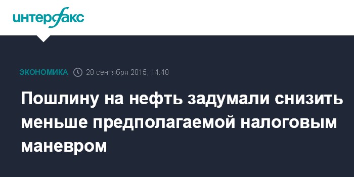 Москва. 28 сентября. INTERFAX.RU - Экспортную пошлину на нефть планируется снизить на меньшую величину, чем предполагалось налоговым маневром, заявил министр экономического развития РФ Алексей Улюкаев журналистам по итогам совещания у премьер-министра.