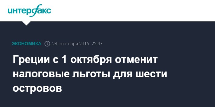 Москва. 28 сентября. INTERFAX.RU – Власти Греции отменят льготные ставки налогообложения для шести популярных среди туристов греческих островов в Эгейском море уже с 1 октября согласно договоренностям с международными кредиторами.
